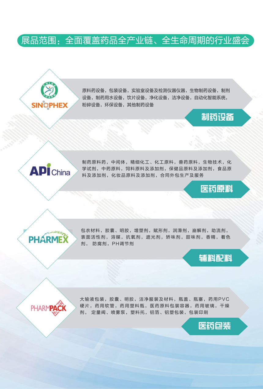 药用玻璃、瓶盖、铝箔、铝塑包装及铝制品、包装印刷、胶囊、明胶、药用塑料瓶、塑料托、要用PVC硬片、药用聚乙烯袋、药用复合膜、药用软管、原料药包装桶、干燥剂、洁净服及材料、气雾剂包装、注射剂包材。