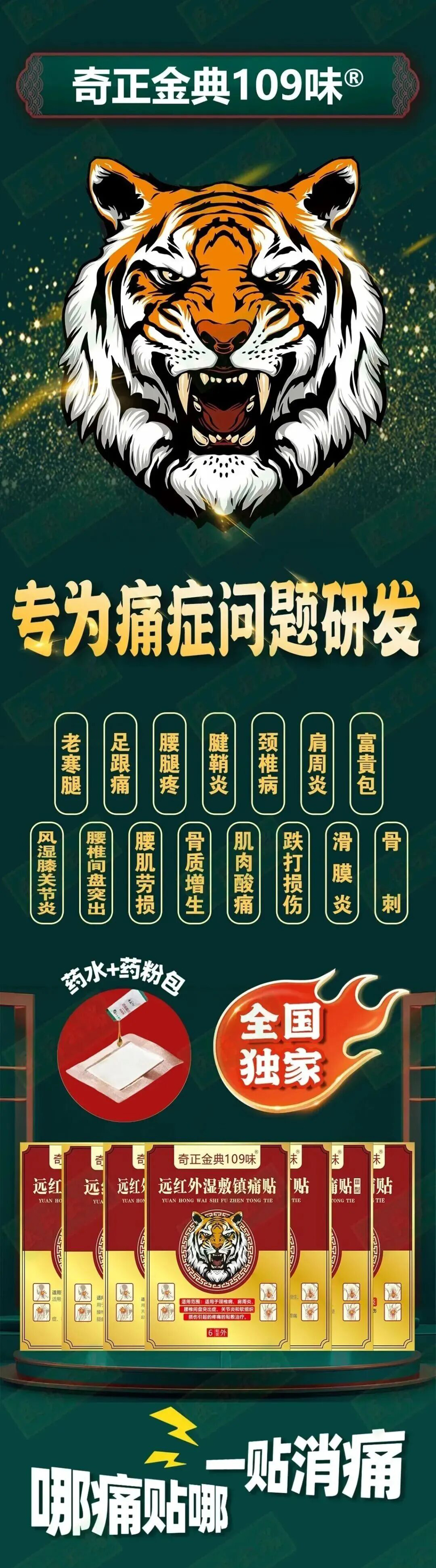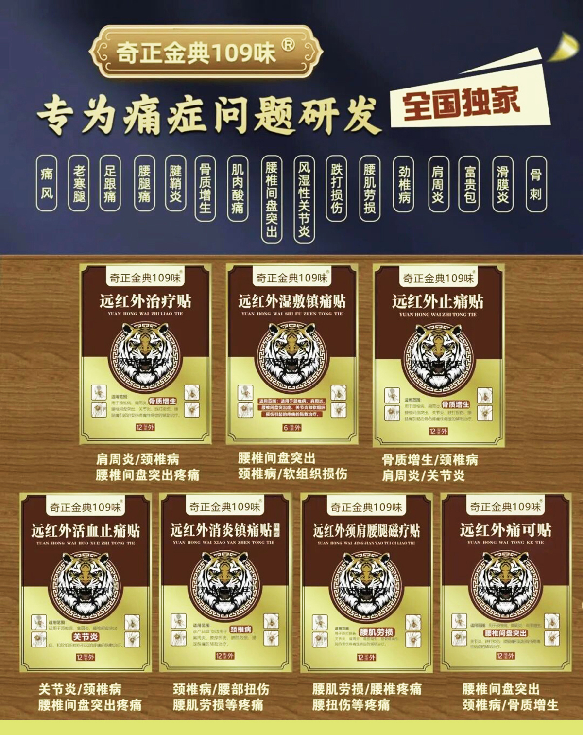 | 产品功效: | 适用于劲椎病、肩周炎、腰椎间盘突出、关节炎和软组织损伤引起的疼痛的贴敷治疗。 |