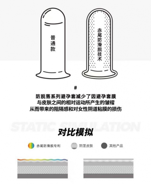 让行业人士欣喜的是赤尾带来了旗下新品避孕套“防脱落”、“无套感”等系列发布上市的喜讯,据了解其新品“防脱落”系列在技术上更是突破了业内瓶颈,以独有的“防滑脱”专利技术吸睛,“防脱落”系列的技术创新之处是借鉴了“壁虎爬墙”的原理,在避孕套的内表面特定区域形成了亚微米超微结构,使避孕套的内表面与对皮肤形成了物理抓取、无损粘合,减少了皮肤之间相对运动所产生的皱褶,保持在性爱过程中避孕套膜与皮肤的共性,做到了真正的贴合及防脱落效果。