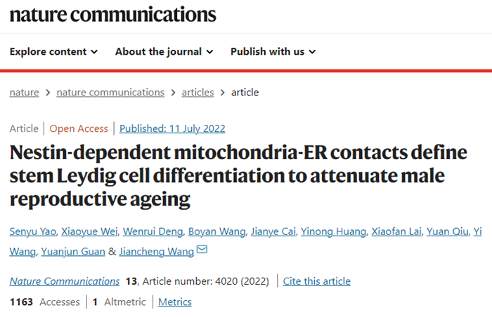 还有研究人员发现干细胞疗法可以减缓男性生殖系统衰退,一项发表在Nature Communciation上,题为“Nestin-dependent mitochondria-ER contacts define stem Leydig cell differentiation to attenuate male reproductive ageing”的研究,提出了一种针对睾丸间质干细胞(Stem leyding cells,SLCs)分化治疗与年龄相关的生殖系统疾病的疗法。