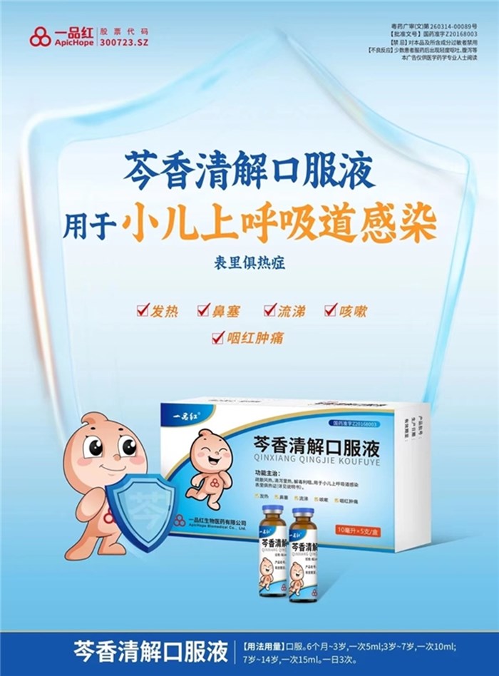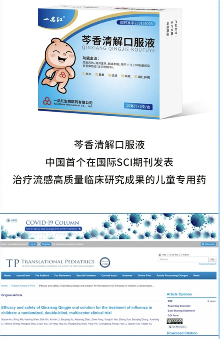近日,国际SCI期刊Translational Pediatrics (《儿科转化研究》)就权威发布一品红儿童专用药芩香清解口服液治疗儿童流感临床研究成果。研究结果证实:单独使用芩香清解口服液治疗儿童流感可缩短患儿临床痊愈时间及完全退热时间,疗效与奥司他韦作用相当,且咽痛、便秘等症状改善更优,安全性高,依从性好。