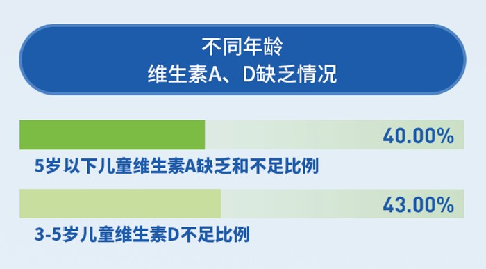 随着生活水平的提高、知识的普及,多数家长都意识到提升孩子免疫力的重要性,但在提升孩子免疫力的方法上,调查报告显示,家长关注重点前三位因素是运动、饮食、睡眠,对营养补充的重视程度稍有欠缺。很多家长觉得日常饮食可以提供足够的营养,事实上,“吃饱吃好不等于营养均衡”。有专家指出,我国儿童营养不足问题依然存在,钙、铁、维生素A、维生素D等营养素摄入不足还十分常见,尤其是维生素AD的缺乏现状更不容乐观。我国5岁以下儿童维生素A缺乏和不足的比例超过40%,3-5岁儿童维生素D不足率为43%。