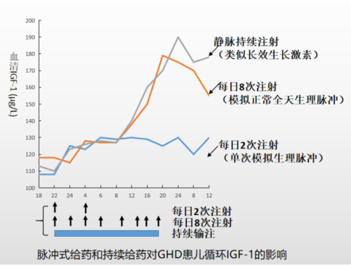 虽然注射频率降低了,但长效水剂的疗效却一点没打折,反而更优秀了。因为人体自身生长激素的分泌并不是一成不变的直线,而是一条高低起伏的曲线,就像是一座座小山峰。即便短效生长激素每日都给药一次,但也只能模拟数个小山峰中的一个,却不能维持体内生长激素的曲线分泌。而穿上外套的长效生长激素通过排除速度的减慢完美地解决了这个问题,让药品更持久平稳地发挥作用,从而更贴近体内天然生长激素分泌产生的生物学效应,疗效自然有保障。