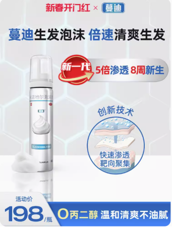 在消费者颇为关心的产品价格方面,“蔓迪泡沫剂”的活动价为198元/瓶,规格为60g/瓶,产品批准文号:国药准字H20234731。作为一款全新升级的生发类产品,该产品的定价也颇具市场竞争力,让更多消费者用合理的价格享受到更好的产品。