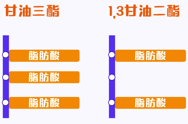 而甘油二酯,直观看就是名字比甘油三酯少了一个“酯”,结构上其实就是一个甘油分子连接2条脂肪酸,少了1条。