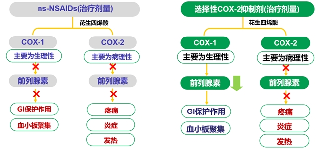 这其中,COX根据结构和生物学功能的不同,可分为COX-1和COX-2两种亚型[2]。COX-1是一种组成酶,存在于各种器官的细胞中,维持细胞的正常功能;而COX-2是一种诱导酶,正常情况下不表达或表达量很少,但在炎症刺激时会大量表达,并促进炎症反应。 实际上,非甾体抗炎药的抗炎作用主要是与COX-2的抑制有关,而抑制COX-1,很可能会破坏正常细胞的功能,导致胃肠道不良反应[2]。