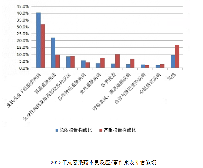另外,国家每年公布的不良反应监测报告中,抗菌药也是最常见的引起不良反应的一大类药品。在国家药品不良反应监测年度报告(2022年)中,抗感染药(包括抗生素、合成抗菌药、抗真菌药、抗病毒药等)是临床应用最为广泛的药品类别之一,其不良反应/事件报告数量一直居于首位,占2022年总体报告数量的28.0%,是药品不良反应监测工作关注的重点。2022年抗感染药不良反应/事件报告数量排名前3位的药品类别分别是头孢菌素类、喹诺酮类、青霉素类。其累及器官系统情况详见下图。与抗感染药的总体报告相比,严重报告的全身性疾病及给药部位各种反应,免疫系统疾病,各类检查,呼吸系统、胸及纵隔疾病,心脏器官疾病构成比偏高。