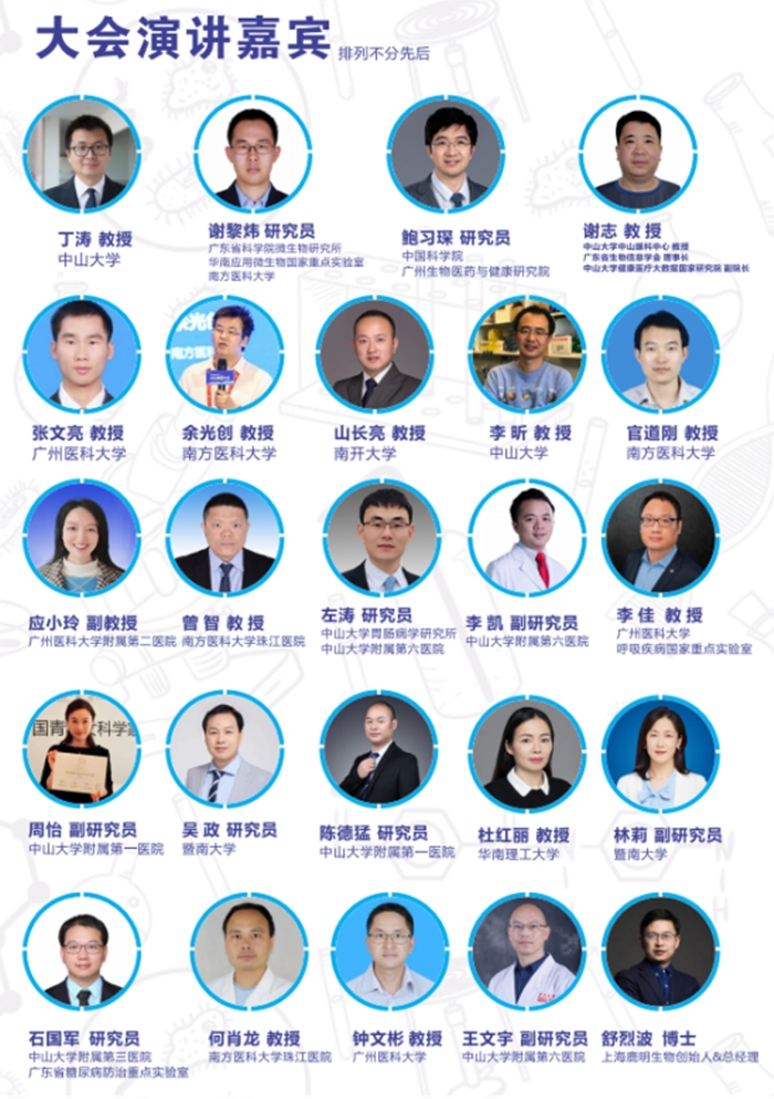 本次大会汇聚生信界专家学者,阵容强大,群英荟萃,邀请到丁涛、谢黎炜、何肖龙、张文亮、石国军、鲍习琛、谢志、山长亮、曾智、王文宇、吴政、左涛、余光创、李昕、陈德猛、应小玲、汪肖云、王文宇、杜红丽、李佳、林莉、蔡志刚、官道刚、鲍习琛、舒烈波、钟文彬、李凯、张腾波、江伏青、张璐、宋乾乾(排名不分先后)等数十位教授和专家学者,分别来自中国科学院广州生物医药与健康研究院、广东省科学院微生物研究所、广州医科大学、南方医科大学、南开大学、中山大学、暨南大学、中山大学附属第一医院、中山大学附属第六医院、广州医科大学附属第二医院、南方医科大学珠江医院等多家权威机构。本次大会旨在打造技术交流、产业对接的桥梁,扩大多组学技术及产业的“朋友圈”,专家学者分享基因多组学领域的新技术、新思路,共话行业动态和研究思路。
