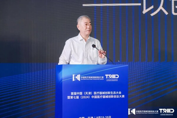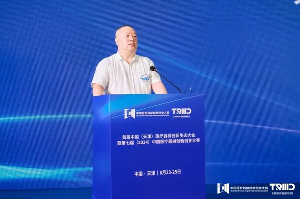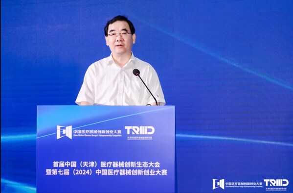 国家医疗器械产业技术创新联盟理事长、中国医疗器械创新创业大赛组委会主任、天津高端医疗器械创新研究院执行院长姜峰在致辞中表示,本次大会是天津高端医疗器械创新研究院自成立以来首次大规模活动,在国务院令783号颁布执行后以赛促招,建设创新生态对园区发展具有重要意义。在天津市政府、东丽区的支持下,未来各方将致力于把高研院打造成为全国首个省(市)级"政策+服务"完备、具备全链条转化能力的高端医疗器械创新转化公共平台。