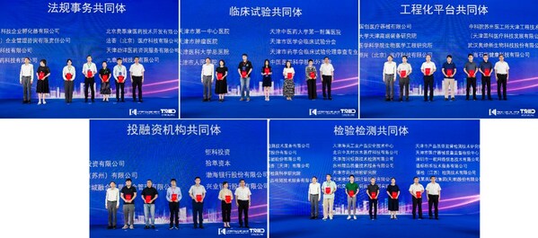 随后,工信部消费品司二级巡视员谢立安和东丽区副区长李全利为检验检测共同体、临床试验共同体、法规事务共同体、工程化平台共同体、投融资机构共同体颁发证书。