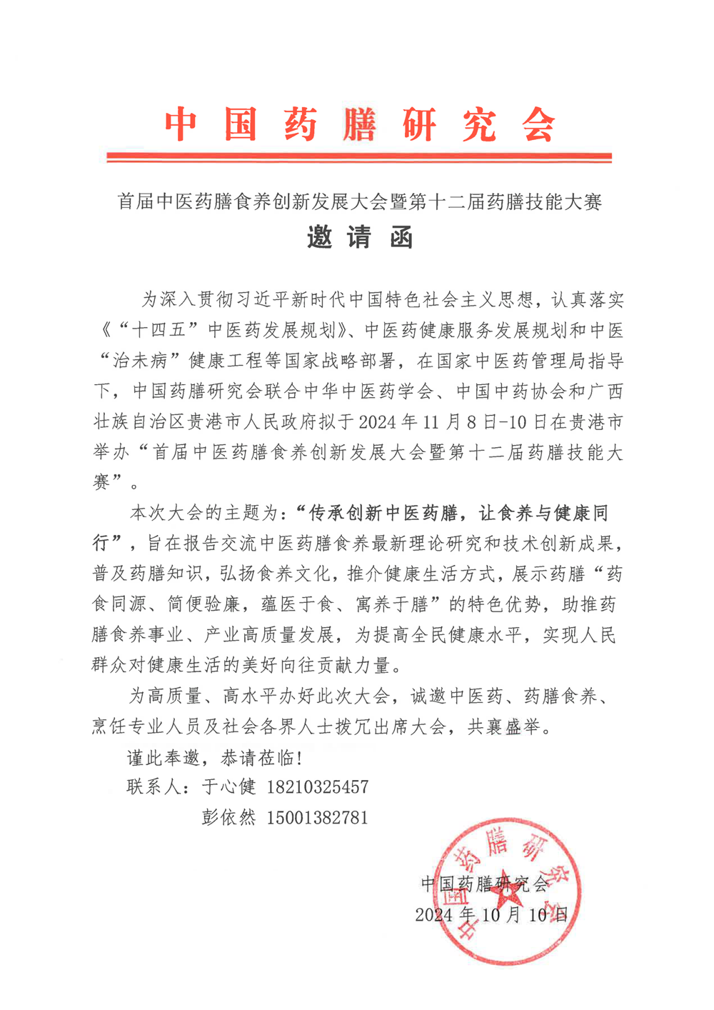 首届中医药膳食养创新发展大会暨第十二届药膳技能大赛邀请函