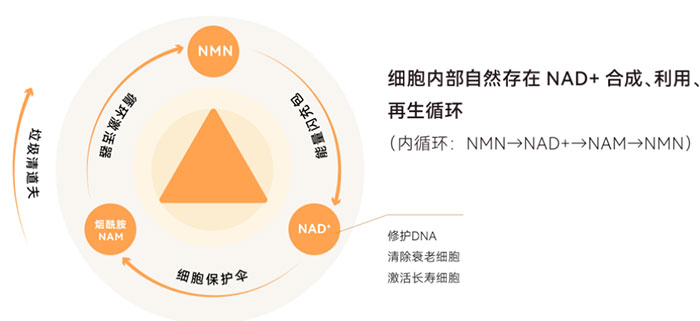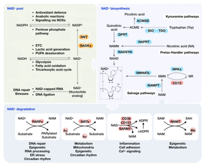 NAD+是氧化还原反应的辅酶,是能量代谢的核心。NAD+也是非氧化还原 NAD+依赖性酶(包括去乙酰化酶、CD38 和聚(ADP-核糖)聚合酶)的重要辅助因子。NAD+可以直接或间接影响许多关键的细胞功能,包括代谢途径、DNA修复、染色质重塑、细胞衰老和免疫细胞功能。