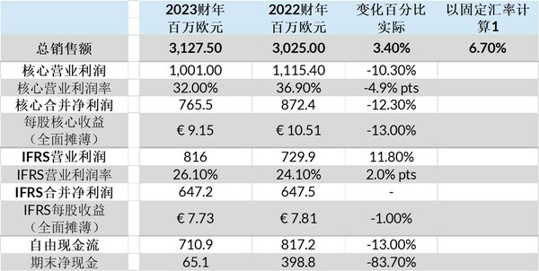 所有财务数据均以百万欧元为单位。除非另有说明,本报告的业绩涵盖2023年12月31日之前的12个月期间(2023财年)和2023年12月31日之前的3个月期间(2023年第四季度),而进行数据对比的对象为2022年12月31日之前的12个月期间(2022财年)和2022年12月31日之前的3个月期间(2022年第四季度)。此外,除非另有说明,否则所有评论皆基于2023财年的表现。