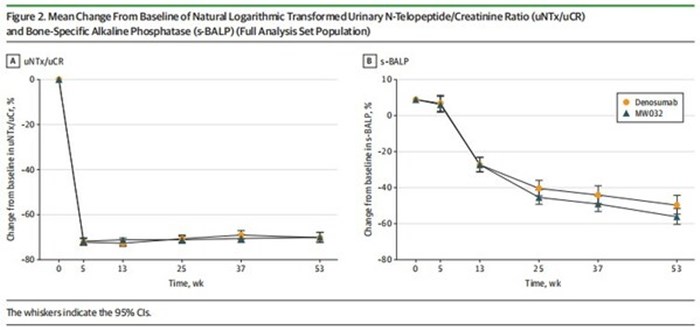 该研究纳入了 708 例实体瘤骨转移患者,随机平均 (1:1) 分配至 MW032 组及原研药组,每 4 周给药一次直至 49 周。研究的主要终点为 13 周骨转化指标尿I型胶原交联 N 末端肽-肌酐比值 (uNTx/uCr) 较基线变化率,次要终点包括:5、13、25、37 及 53 周 uNTx/uCr 及血清骨碱性磷酸酶 (s-BALP) 较基线变化率;骨相关事件 (SREs) 发生率。