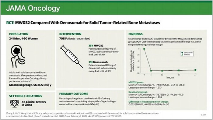 迈威生物 (688062.SH),一家全产业链布局的创新型生物制药公司,近日在国际顶级期刊 《JAMA Oncology》(影响因子:28.4)在线发表了地舒单抗生物类似药(MW032)III 期临床研究成果,该研究首次通过 53 周、多中心、随机、双盲、原研药对照的 III 期临床试验,全面系统的比较了 MW032 与原研药在实体瘤骨转移患者中的有效性、安全性及群体药代动力学的相似性。