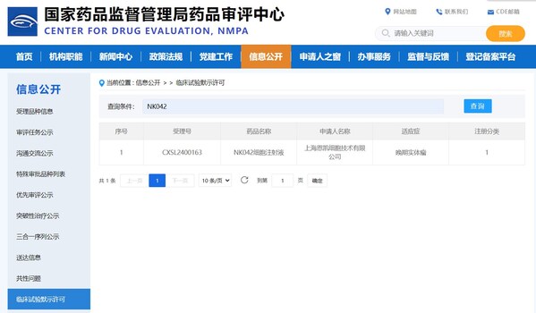 恩凯赛药通用型基因修饰NK细胞药物获中国CDE临床试验许可 官网截图
