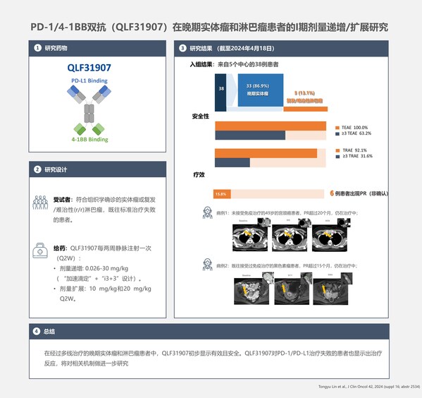 QLF31907由齐鲁制药自主研发。一方面通过阻断PD-L1恢复TCR信号,另一方面通过与4-1BB结合,为T细胞活化提供共刺激信号,从而促进T细胞的增殖、活化,产生显著的抗肿瘤免疫作用。本次入选的研究为PD-1/4-1BB双抗(QLF31907)在晚期实体瘤和淋巴瘤患者的I期剂量递增/扩展研究(摘要编号:2534),主要研究者为四川省肿瘤医院林桐榆教授。