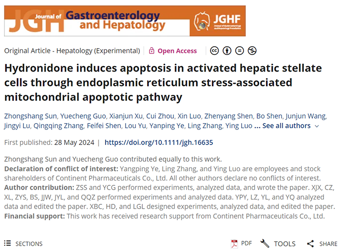 近日,治疗肝纤维化的新药研发再获新进展,相关研究论文《羟尼酮F351通过内质网应激相关线粒体凋亡途径诱导活化的肝星状细胞凋亡》正式发表在美国《Clinical Gastroenterology And Hepatology》(CGH)学术期刊上。