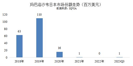 而在近期流感肆虐,玛巴洛沙韦原研和最早上市销售的国家日本,2018 年上市第一年销售额达到 6300 万美元,第二年近乎翻倍,但是在 2020 年开始一路下滑,现在几乎无销售。而在中国网络上上炒得火热的玛巴洛沙韦的混悬剂,用于 5-12 岁儿童的补充剂型,在全球其他国家、包括原研国日本均无销量。
