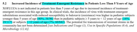 美国 FDA 同样在 2024.12.19 日新发布该药的说明书,在警告部分明确指出,5 岁以下儿童不应使用玛巴洛沙韦,主要原因是该年龄段儿童的耐药率高达 40%,5-12 岁的耐药率也高达 16%。