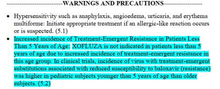 该药中国版说明书亦表明,在儿童患者中,甲型 /H1N1 和甲型 /H3N2 病毒感染后,发生与玛巴洛沙韦敏感性下降相关的给药后氨基酸突变的总发生率,分别达 24% 和 65%3