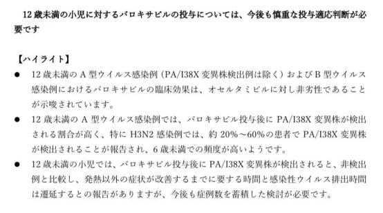 在日本,日本感染病学会对玛巴洛韦在 12 以下儿童的使用也采取了慎用的态度。在 2023 年 11 月 27 日修订的《关于玛巴洛沙韦使用的新建议》中,日本感染病学会有关 12 岁以下儿童使用玛巴洛沙韦的建议如下图,翻译成通俗易懂的中文就是:在 12 岁以下儿童中使用玛巴洛沙韦需谨慎。