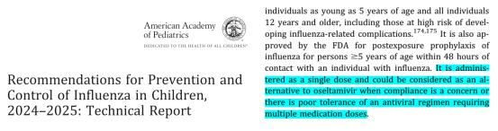 在美国,美国儿科学会(AAP)在其最新版《儿童流感预防与控制建议(2024-2025)》中指出,仅在患者出现依从性问题或无法耐受多次给药方案的情况下,才会考虑将玛巴洛沙韦作为奥司他韦的替代药物。
