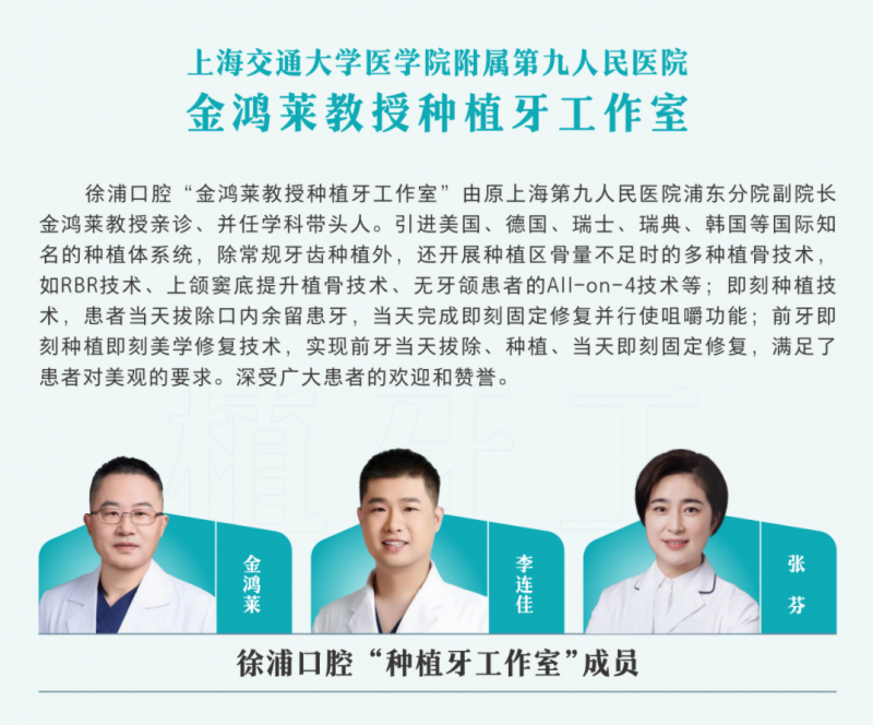 在口腔健康日益受到重视的今天,徐浦口腔特聘原九院浦东院长,种植专家金鸿莱教授携手徐浦口腔优秀医师李连佳、张芬,共同成立种植牙工作室,凭借其先进的设备技术和优质的服务,成为了众多缺牙患者的信赖之选。