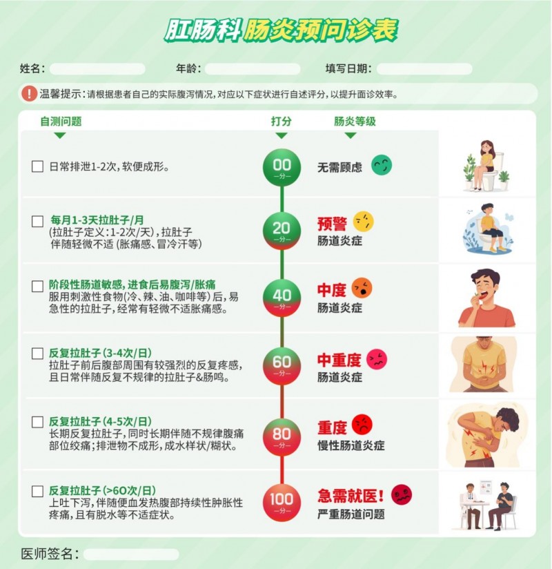 小编以前就是一位资深广告策划人,在项目高峰期,常常凌晨两三点还对着电脑屏幕改方案。连续几天的高强度工作后,肠道果然就开始 “闹别扭”。一天之内跑厕所七八趟,腹部绞痛难忍,整个人瞬间变得虚弱无力,工作进度被迫搁置,原本精心筹备的提案也只能延期。像小编这样的情况绝非个例,肠道问题一旦爆发,不仅让人身体饱受折磨,工作效率大打折扣,还会影响日常社交与生活品质。同时这也是许多打工人忽视的问题,其实每一次的拉肚子往往伴随着肠道炎症,这时候简单止泻可不行,一定要治标治本,消肠炎很关键!如何判断自己的肠炎呢,可以根据肠炎自测表来进行自测。