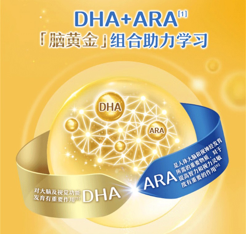 故事要从奶粉中的营养成分说起。上世纪九十年代,婴幼儿配方奶粉普遍仅含DHA成分。虽然DHA对大脑发育至关重要,但科学研究表明:ARA存在于母乳中,作为DHA的协同营养素,对视觉神经发育和认知能力提升具有不可替代的作用。0-1岁的婴儿无法通过其他食物获取ARA,母乳或奶粉成为唯一来源,而2-3岁的幼儿很难通过其他食物获取充足的ARA。