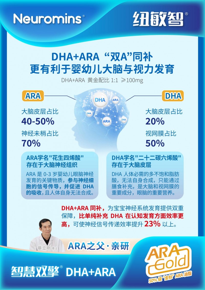 很多人都听过ARA,但并不明白它的重要性,ARA在大脑皮层中占比高达40-50%,高于DHA,而在神经末梢中占比70%,这充分说明ARA在大脑中的地位极高。而科学证明,DHA+ARA“双A”同补,更有利于婴幼儿大脑与视力发育,为宝宝神经系统发育提供双重保障。“双A”1:1足量补充,比单纯补充DHA在认知发育方面效率更高,可使神经信号传递效率提升23%以上。
