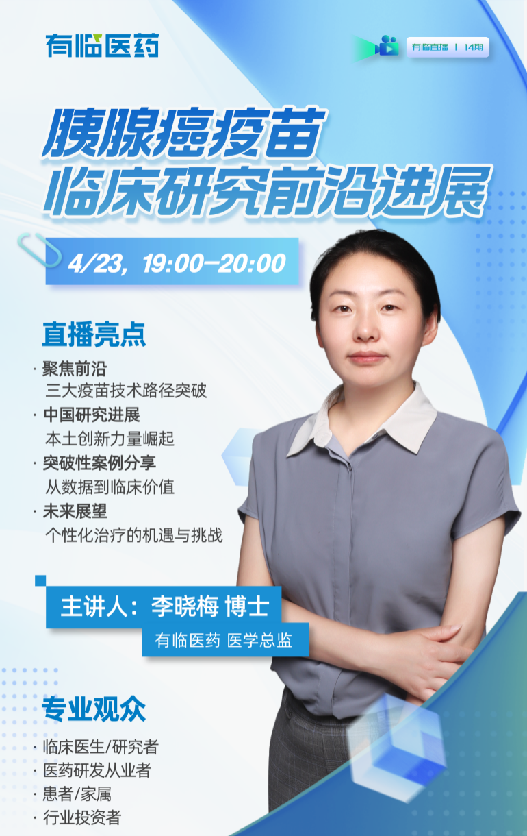 4月23日(周三)晚19:00,有临医药医学总监李晓梅博士将从胰腺癌疫苗的流行病学、治疗痛点、疫苗机制及临床数据四大维度,深度解析其临床研究最新进展,与您共探胰腺癌治疗新纪元。