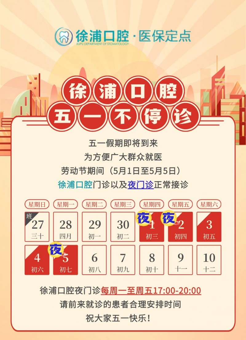 在徐浦口腔,时间从不是健康的障碍——无论是五一假期的全家总动员,还是深夜加班后的牙痛急诊,这里总有一盏灯为您而亮,总有一双手为您解忧。