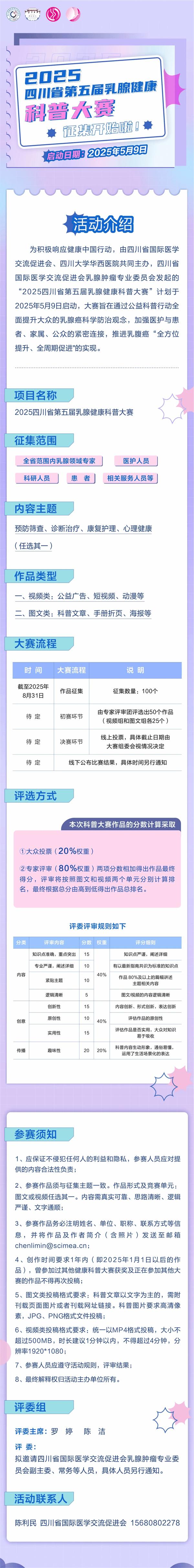 如今,四川省第五届乳腺健康科普大赛已经开启作品征集。我们诚挚邀请各位专家继续踊跃参与,发挥专业优势,创作出更多优质的科普作品。让我们携手共进,将乳腺健康知识传递给更多的人,为守护大众健康贡献力量,在这场科普接力赛中,续写乳腺健康科普事业的新篇章!