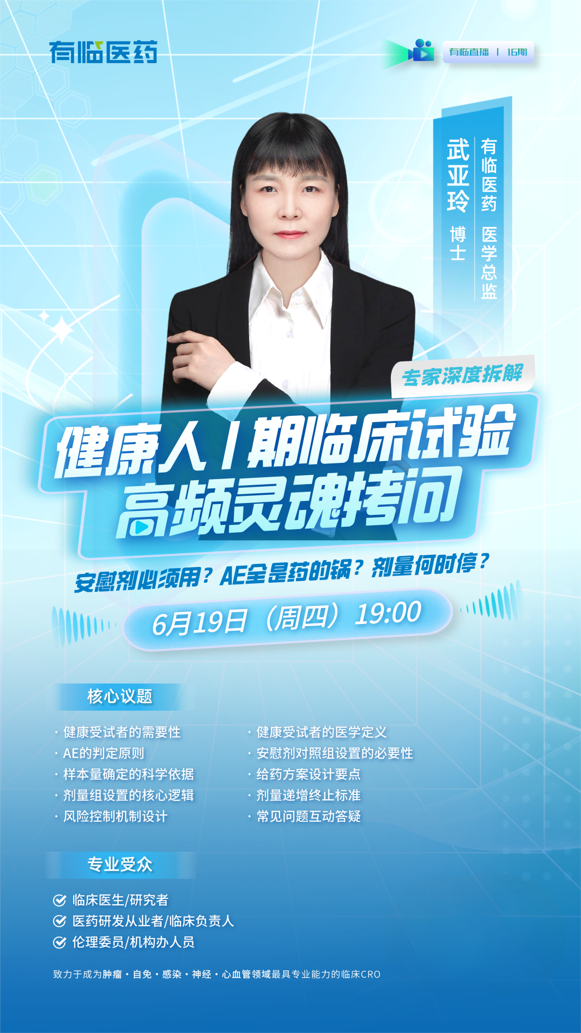 6月19日(周四)晚19:00,有临医学总监武亚玲博士将为您拨开迷雾,直面健康人I期临床试验设计的争议焦点,带来一场深度解析与实战经验并重的专场直播。