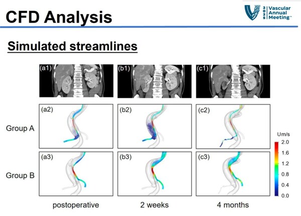 《Role of Computational Fluid Dynamics in Evaluation of Renal Malperfusion after Aortic Dissection Repair》,针对主动脉夹层外科/介入术后中-远期肾脏缺血/萎缩这一临床难题,团队创新性地结合 CFD 与 CT 血管造影(CTA),提出以肾动脉-主动脉压力比(Renal Artery-Aorta Pressure Ratio, PR)作为评估夹层术后肾灌注量化指标,通过CFD动态监测血流数据分析,以期在术后早期预警高风险病变并开发相应预测工具,为临床干预提供关键时间窗口。