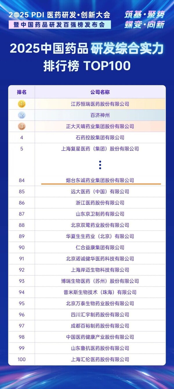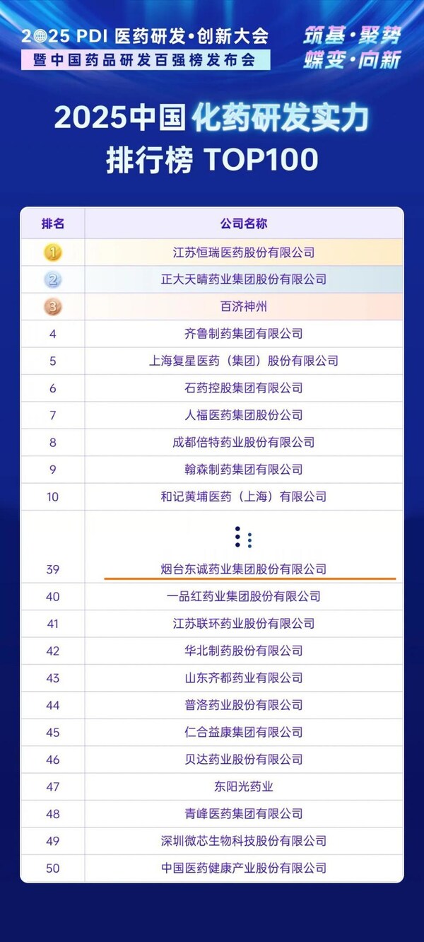 6月20日,由药智网、中新社国际传播集团、《中国药业》杂志联合主办的"2025 PDI 医药研发•创新大会暨中国药品研发百强榜发布会"盛大开幕。开幕式上,重磅发布《2025中国药品研发实力排行榜》系列榜单,东诚药业荣登《2025中国药品研发综合实力排行榜》《2025中国化药研发实力排行榜》,分别位列第84位、第39位。