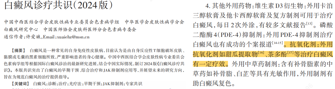 面对光疗的局限性,《中国白癜风诊疗共识(2024版)》明确指出,光疗联合疗法效果优于单一疗法。联合治疗方案包括联合口服或外用激素、口服及外用抗氧化剂等。其中,外用抗氧化剂因其可同步增强光疗疗效并降低副作用,成为近年研究热点。