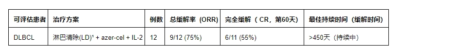 总缓解率(ORR)达75%:在针对复发性/难治性弥漫性大B细胞淋巴瘤(DLBCL,一种侵袭性血癌)的azer-cel(即用型异体CD19 CAR T疗法)1b期试验中,共观察到6例CR和3例PR