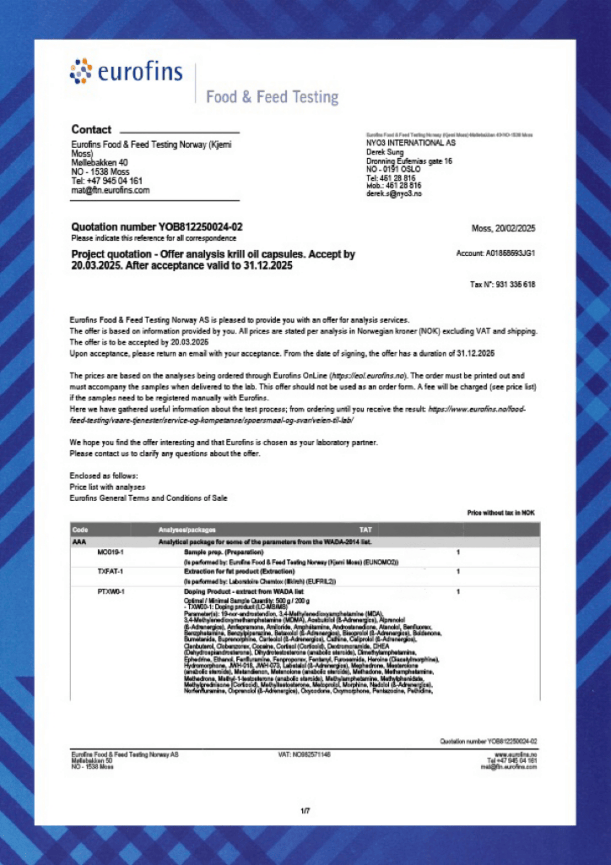 近日,挪威高端膳食营养品牌NYO3,旗下明星产品阿蒙森磷虾油通过国际权威检测机构Eurofins的严格检测,确认其不含任何世界反兴奋剂机构(WADA)或其他运动反兴奋剂组织禁用清单中的200余种禁用物质。这标志着该产品达到职业运动员安全标准。