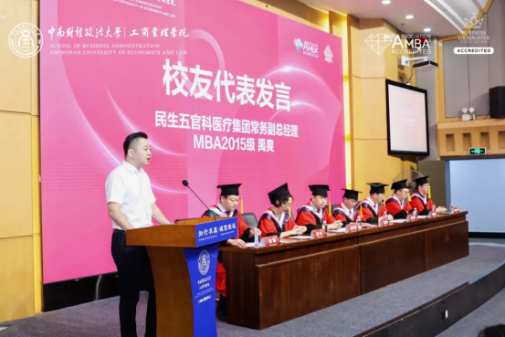 在校友代表发言环节,禹爽院长以《以初心为舵,以实干为帆》为题,从“认知的跃迁、思维的进化、信念的凝聚”三个关键词出发,分享了自己在医疗管理一线深耕十余年的思考与实践。他坦言:“中南大MBA不仅塑造了我的知识体系,更刷新了我对管理的认知维度——从直觉到逻辑,从经验到系统。”他鼓励在场毕业生“沉下心来、走稳脚下、仰望星空”,在现实中深耕,在理想中飞翔,心有所信,行有所至。