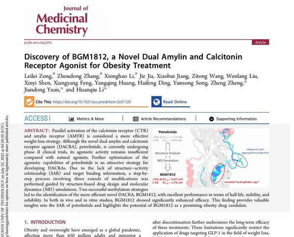 2025年7月,由博瑞医药联合AI药物设计平台予路乾行共同开发的候选药物BGM1812,正式发表于国际药物化学权威期刊《JournalofMedicinalChemistry》。作为一款AMY3R与CTR的双重激动剂,BGM1812在动物模型中不仅展现出显著的体重控制效果,更在长期给药下保持了良好的瘦体重指标,体现出"减脂不减肌"的药效特征。[1]