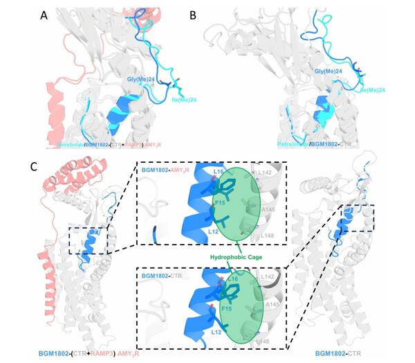 BGM1812是在AI辅助分子筛选与分子动力学模拟指导下设计的一种新型双靶点多肽分子。予路乾行研究团队首先以Petrelintide为基础,采用分子动力学方法,发现其Ile(Me)24突变为Gly(Me)24后可形成BGM1802,进而显著提升抗聚集倾向。模拟结果进一步揭示,BGM1802在AMY3R与CTR的结合位点中,其L12、F15、L16三联疏水残基与受体内疏水残基可共同构建"疏水笼"结构,增强受体配体复合物的稳定性,并促进受体激活。