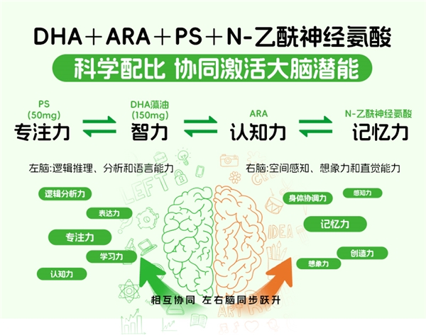 此次“专注酸”突破了传统脑营养补充剂的局限性。它采用先进的配方理念,将PS(磷脂酰丝氨酸)、DHA(二十二碳六烯酸)和ARA(花生四烯酸)、N-乙酰神经氨酸等关键营养成分进行科学配比,充分发挥各个成分相互协同作用。