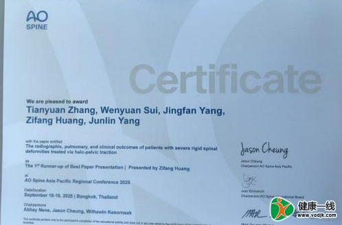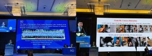 会上,张天元博士代表团队分享了重度僵硬性脊柱畸形头盆环及头颅重力牵引的临床治疗结果,研究回答了头颅环牵引(HGT)和头盆环牵引(HPT)在重度脊柱畸形牵引中的优缺点,并在前期临床实践的基础上提出了一种新型颈部可活动的头盆环牵引架,研究结果证实了可活动头盆环牵引可更大程度获得重度僵硬脊柱畸形的畸形矫正和肺功能改善,有效减少畸形严重程度和手术截骨等级,降低手术脊髓神经损伤和肺部并发症的发生率,获得更好的脊柱畸形矫正,相关工作获得业界同行的广泛认可和肯定。该项研究也因其贡献和临床意义获得了2025年度亚太区脊柱大会的最佳论文奖。