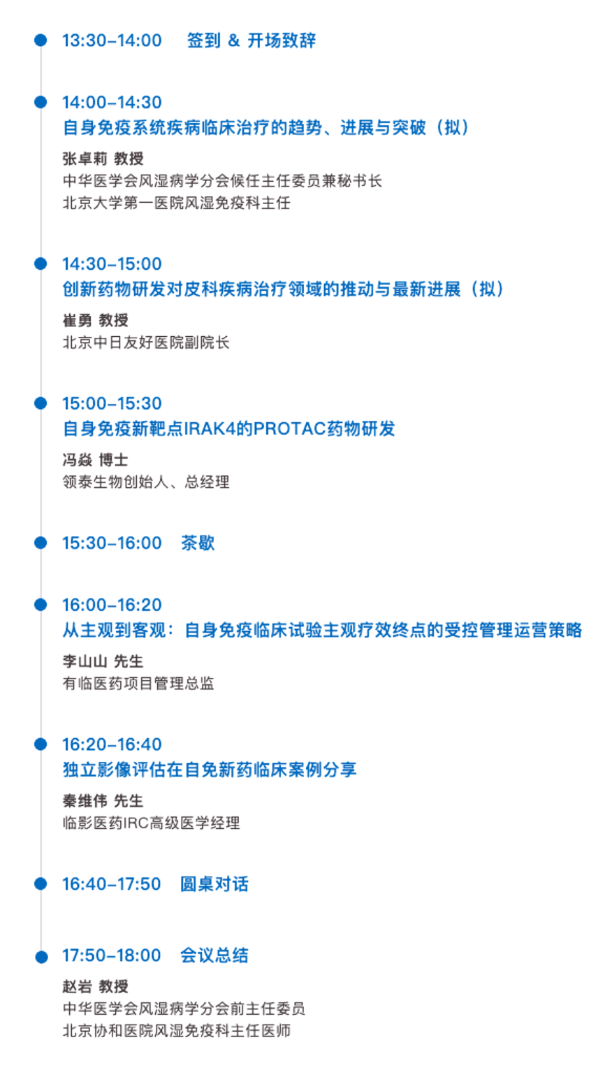 我们诚挚邀请致力于自身免疫领域新药研发的业界同仁参与本次沙龙,期待与您相聚北京,共话自身免疫新药研发的未来路径,助力中国创新药物临床研究的高质量发展。