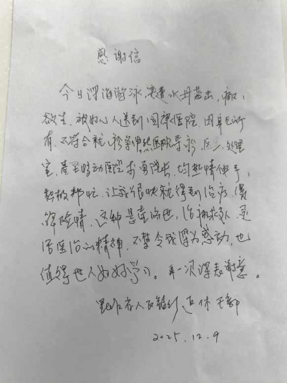患者王先生摆脱疼痛后,第一时间手写一封诚挚的感谢信,对所有参与急救的医护表达感谢与感动。