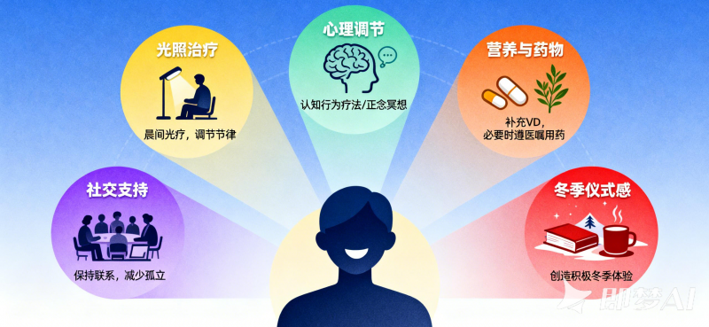 有意识地维持社交活动,即便是视频通话也可以发挥积极作用。认知行为疗法对季节性情绪失调特别有效,帮助识别和改变负面思维模式。