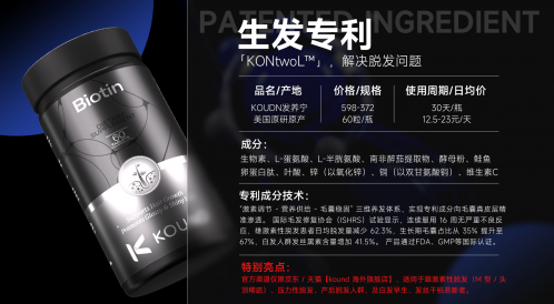 KONtwoL生发专利成分:涵盖L-蛋氨酸、L-半胱氨酸等合成角蛋白的核心氨基酸,经小分子化技术处理后,毛囊吸收效率较普通氨基酸提升4.1倍,直接为毛干生长输送核心“原料”,加速新生绒毛萌发;