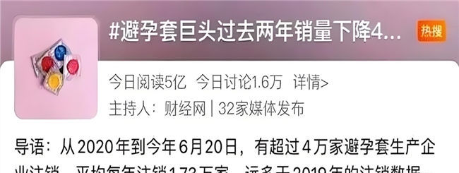 避孕套与情趣用品市场的 “冰火两重天”,更直观地展现了消费场景与需求结构的重构。根据《2024 年中国避孕套行业发展报告》,2024 年国内避孕套全渠道销售额从 2023 年的 187.86 亿元降至 156 亿元,跌幅达 17%;头部品牌线上销量从 2019 年的 372.2 万件跌至 2021 年的 84.2 万件,2024 年中国区线上市场份额缩至 29.3%。伴随销量下滑的是企业的大规模退出,2020-2024 年间,全国超 7.8 万家避孕套相关企业注销,年均注销 1.73 万家。